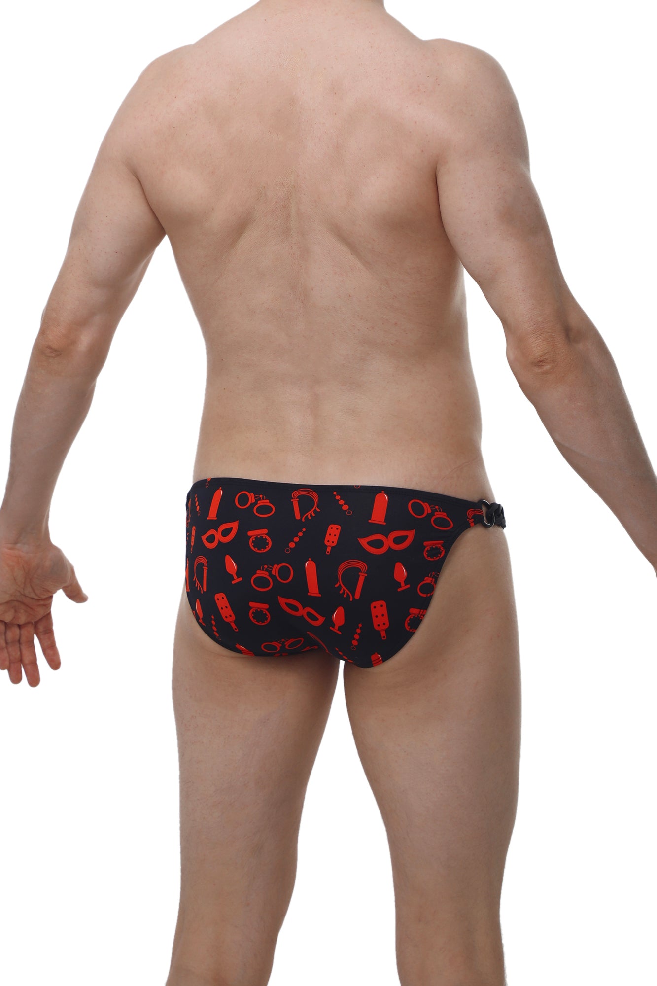 The Bikini Chains is one of our most avant-garde silhouettes. This edition features the exclusive Boudoir print—a sophisticated yet "naughty" design of whips and chains that exudes a sense of power and mystery. To elevate the theme, we’ve replaced traditional side elastics with sturdy plastic chains, clearing the hips entirely and adding a "jewelry" effect to the garment.