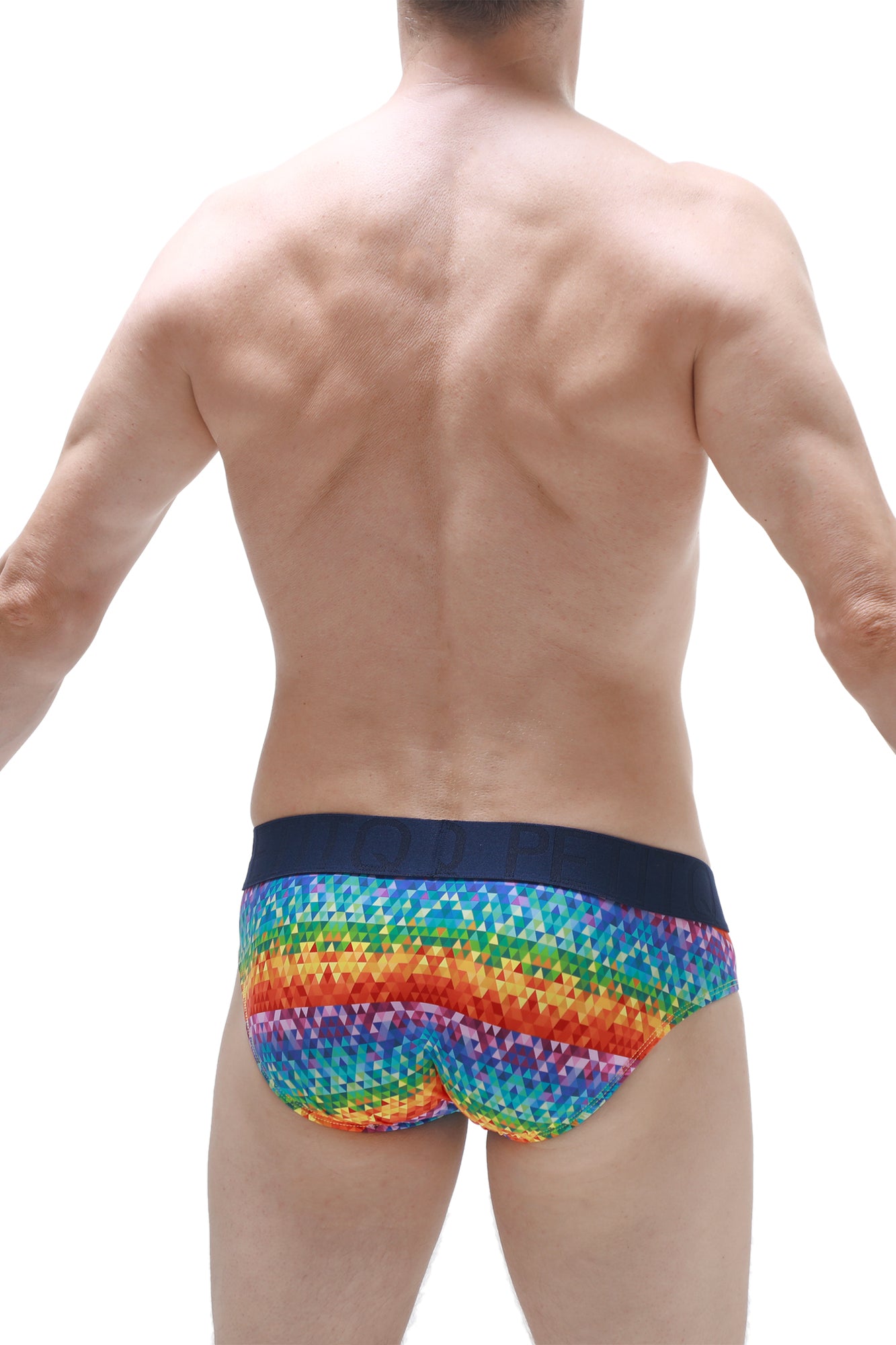 Nylon brief with full coverage on the back. Low rise in the front. Fun colorful pattern.